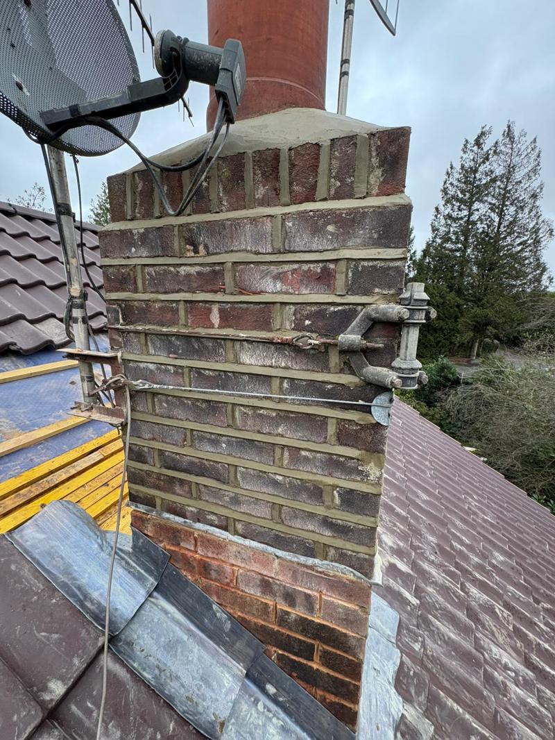 The chimney stack was inspected and repointed where required. Loose and deteriorated mortar joints were raked out and replaced, improving stability and preventing water ingress around this vulnerable area.