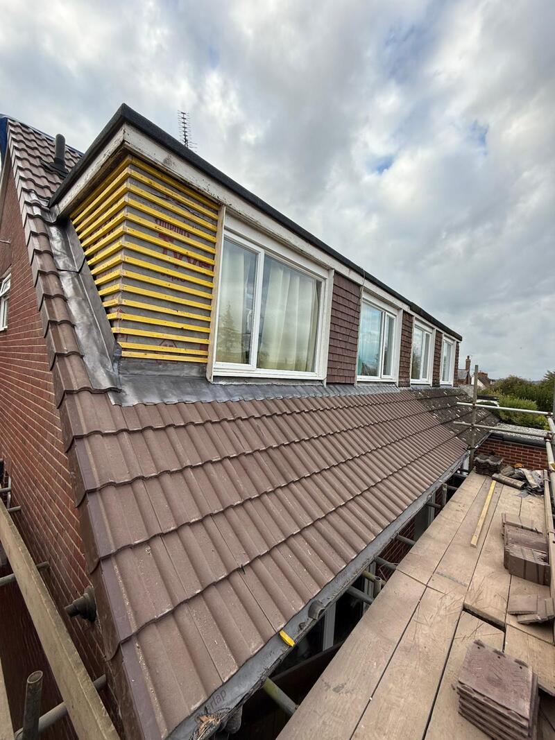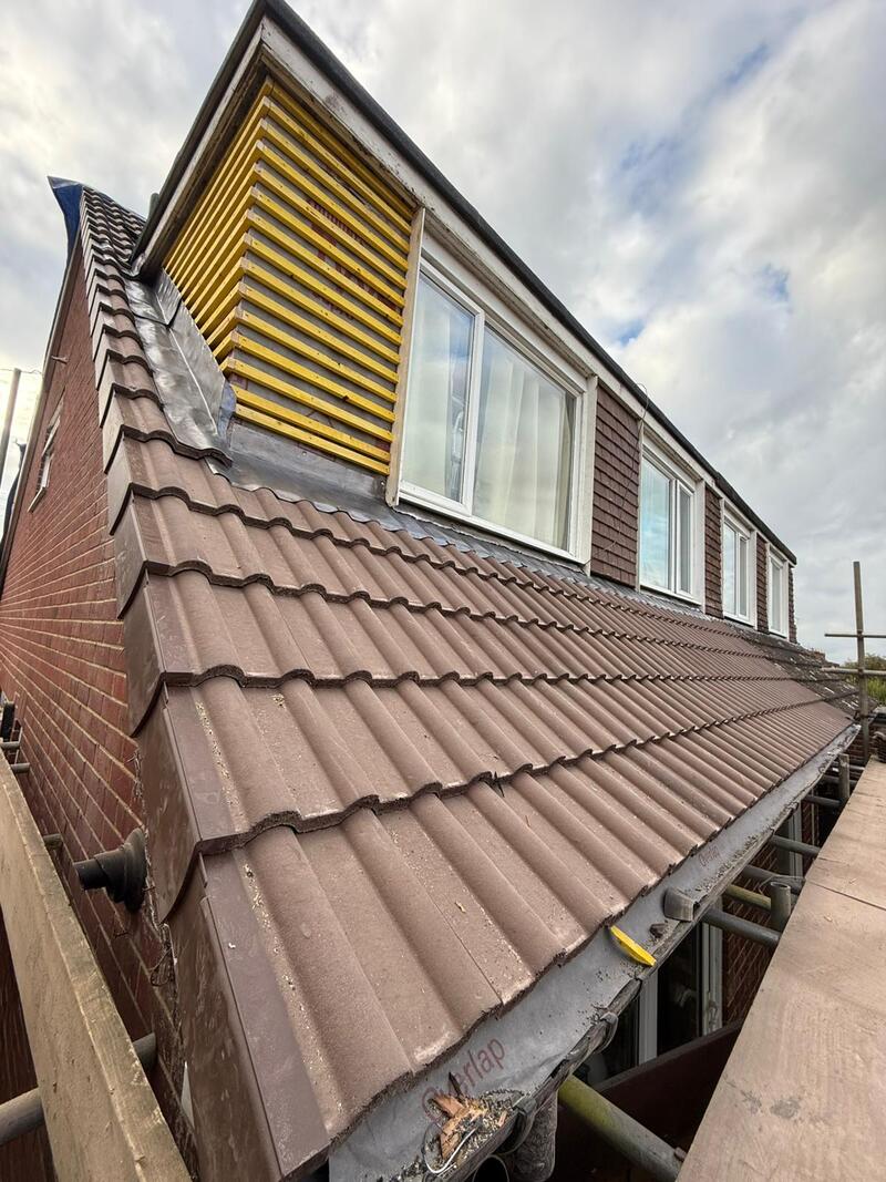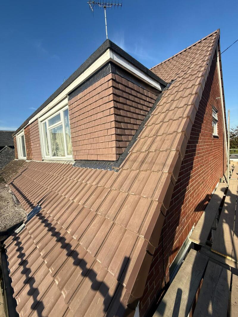 - The new roof was finished using modern brown concrete tiles, chosen to blend perfectly with the property’s existing features. We also renewed the ridge system and installed lead flashings around the dormer windows for extra weatherproofing.