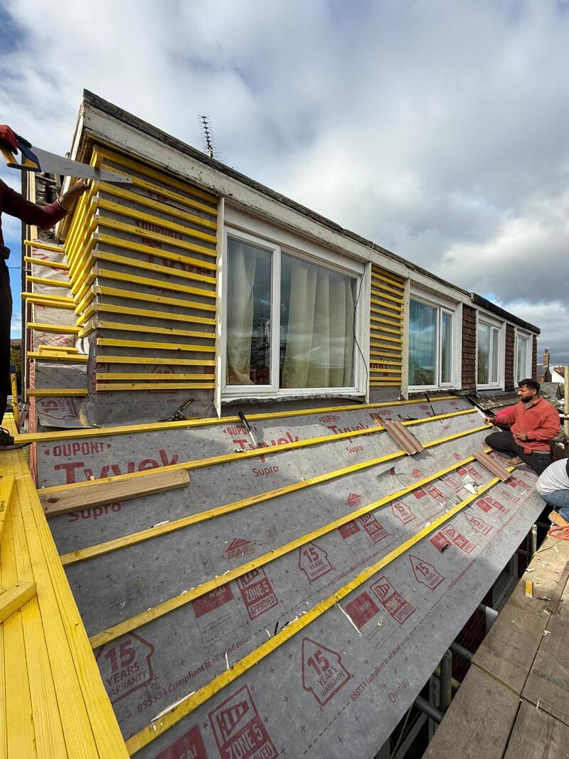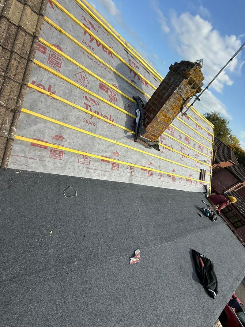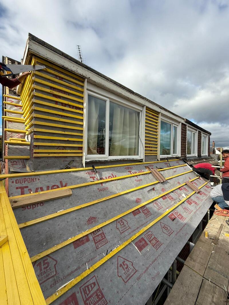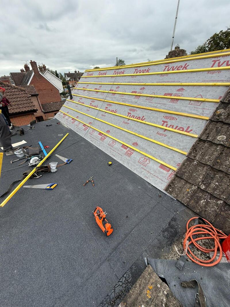 - We installed a high-grade DuPont Tyvek Spro breathable membrane, providing outstanding water resistance while allowing ventilation. Treated timber battens were then fixed securely in place, ready for the new tiles to be laid.