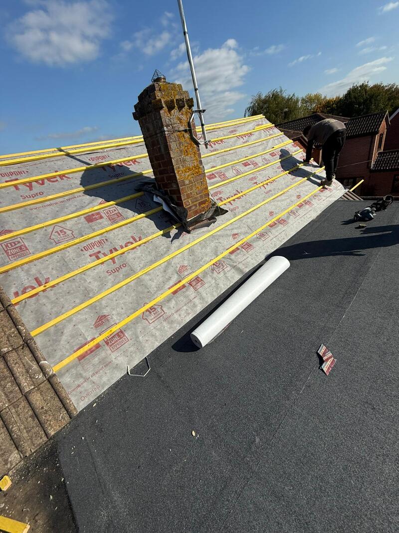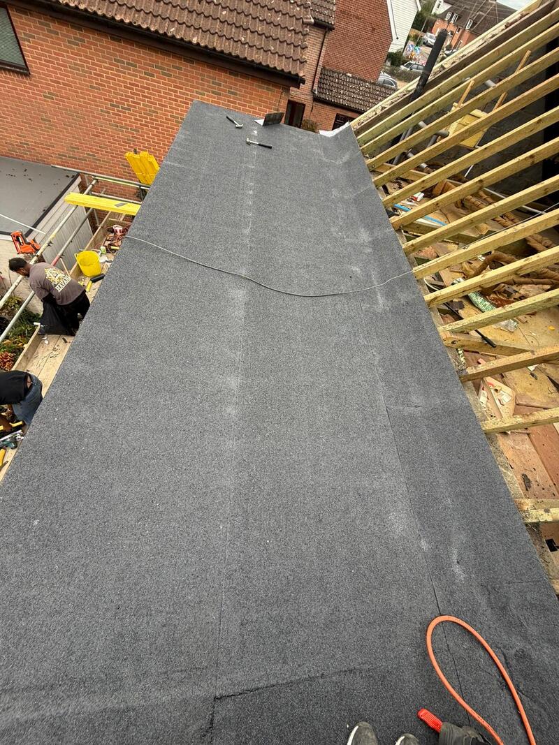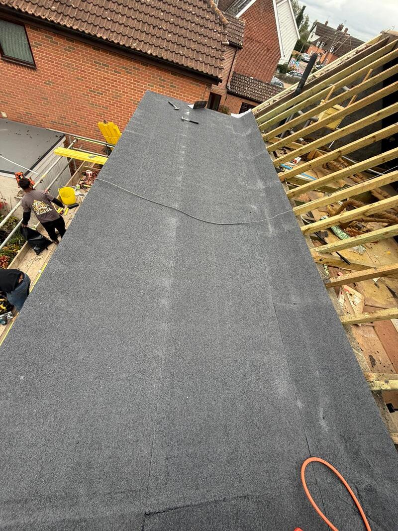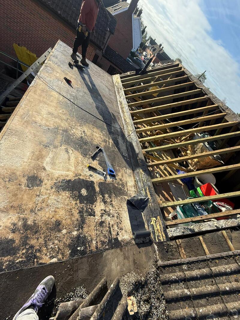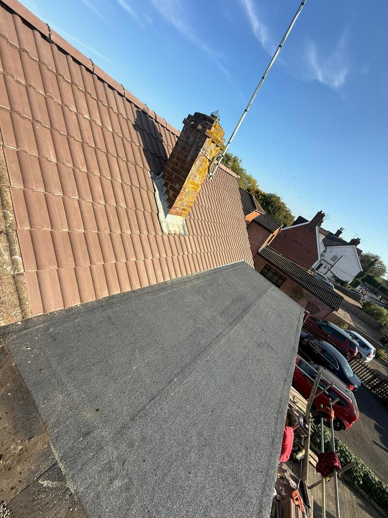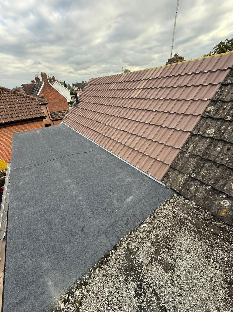 - This project also included refurbishing the adjoining flat roof section. We replaced the old covering with a durable felt system, applied with precision to deliver a smooth, watertight finish that seamlessly joins the pitched roof area.